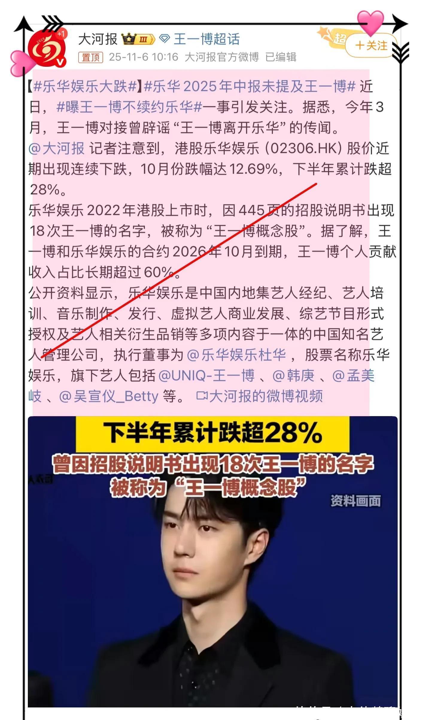 随后媒体报道了乐华娱月份的gu价也是直线下跌!网友说乐华娱乐,王一博一个人贡献了六成的收入,他要是不续约,有影响也在所难免!